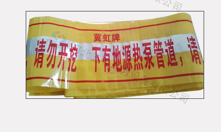 地埋式可探測警示帶:寬度:10cm-150cm 厚度:0.12mm、0.15mm、 顏色:多用黃底紅字。中間夾層中有一層鋁箔,寬度約為5-cm