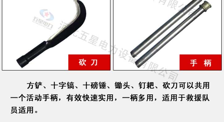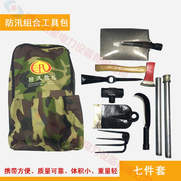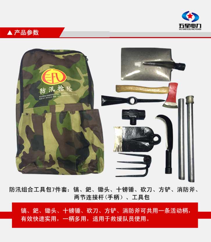 防汛組合工具包七件套:鎬、鈀、鋤頭、十磅錘、砍刀、方鏟、消防斧頭、活動柄、工具包。一柄多用,適用于救援隊(duì)員使用