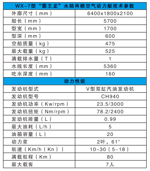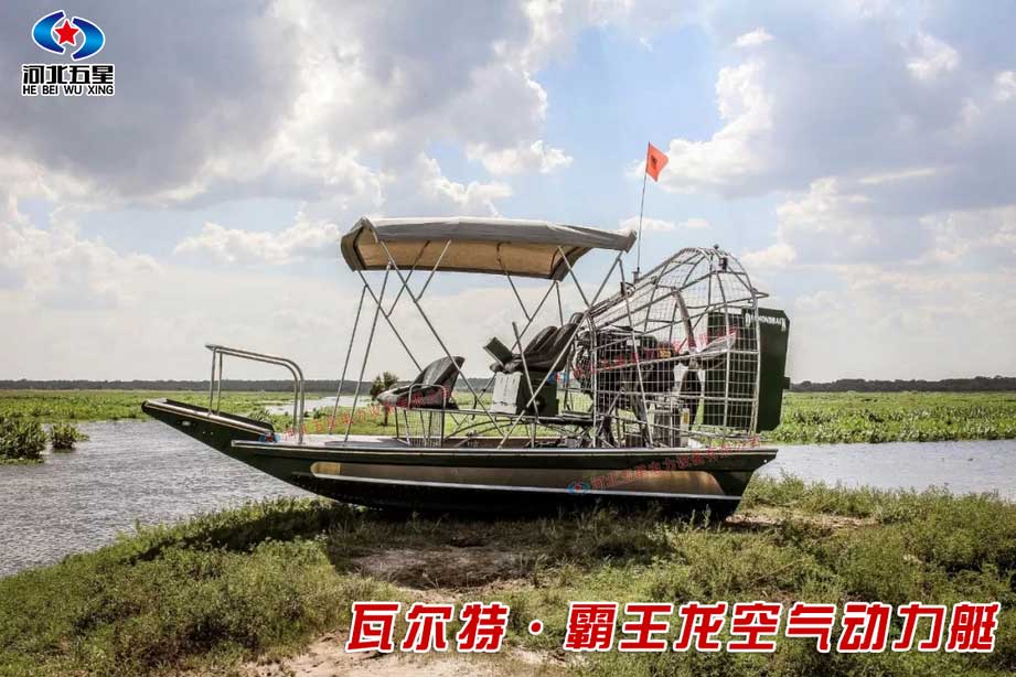 河北五星“霸王龍”水陸兩棲空氣動力艇是一種運用空氣動力學、采用航空發(fā)動機和空氣螺旋槳推動,通過置于船體上部的大功率內燃機帶動碳纖維螺旋槳產生空氣動力的多地形交通工具。所搭載的航空發(fā)動機動力系統強勁,功率可達300馬力以上,螺旋槳推力可達500公斤以上,操縱機動靈活,靜水巡航速度可達40km/h,可以高時速可達70km--120km/h。